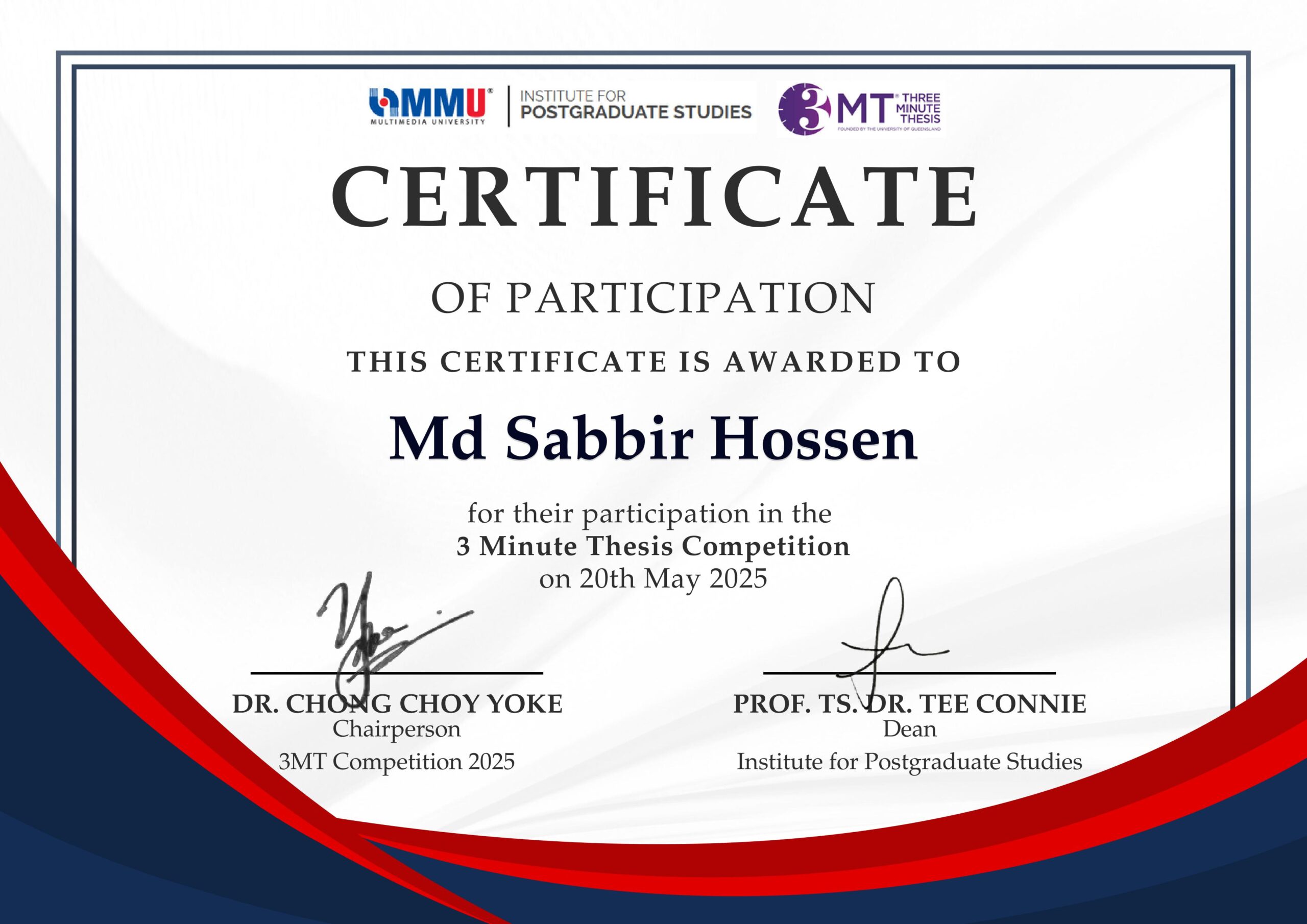 Currently, I am pursuing my Master’s by Research in the Faculty of AI and Engineering at Multimedia University (MMU), Malaysia, under the supervision of Prof. Dr. Gobbi Ramasamy and Dr. Ngu Eng Eng.