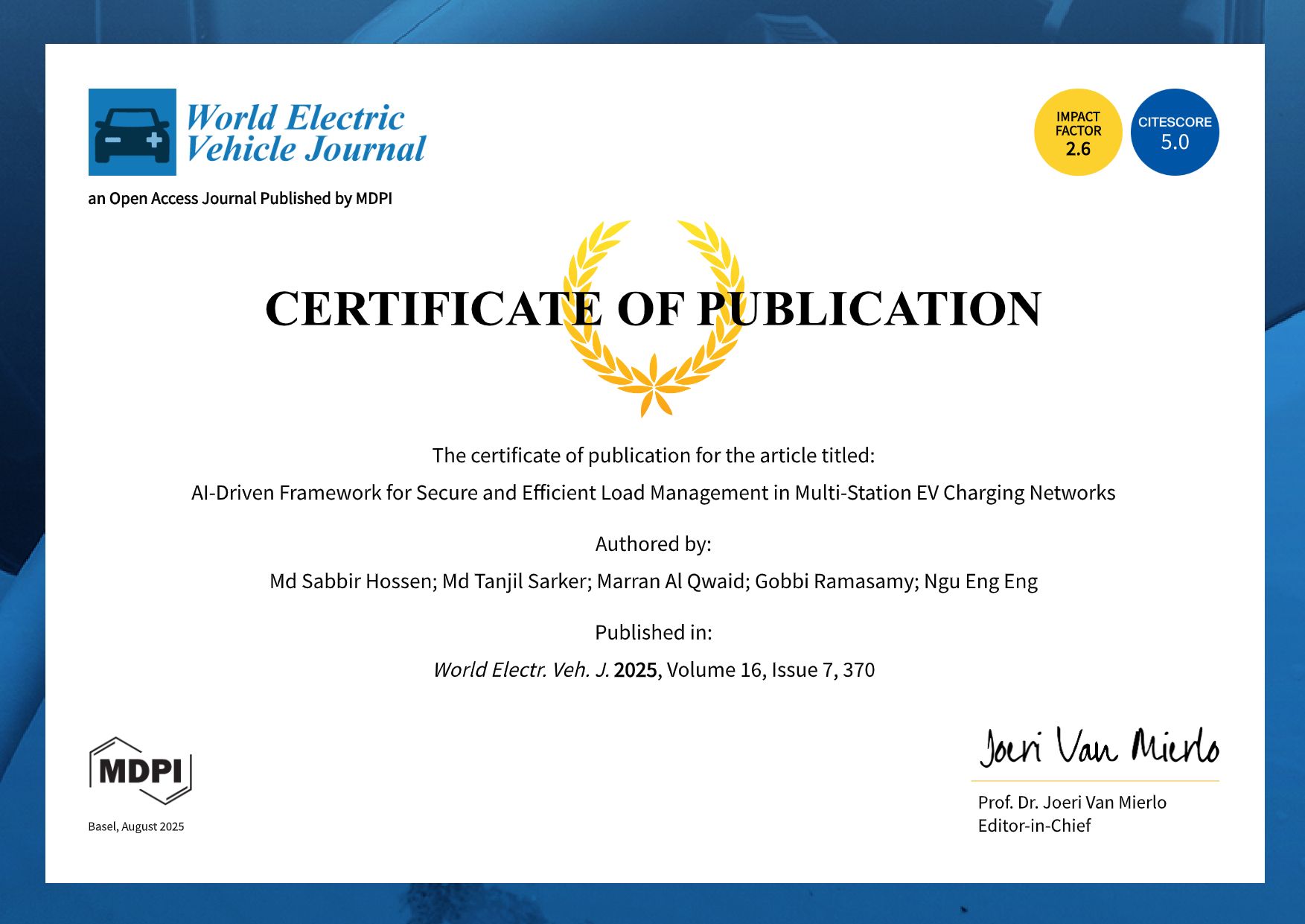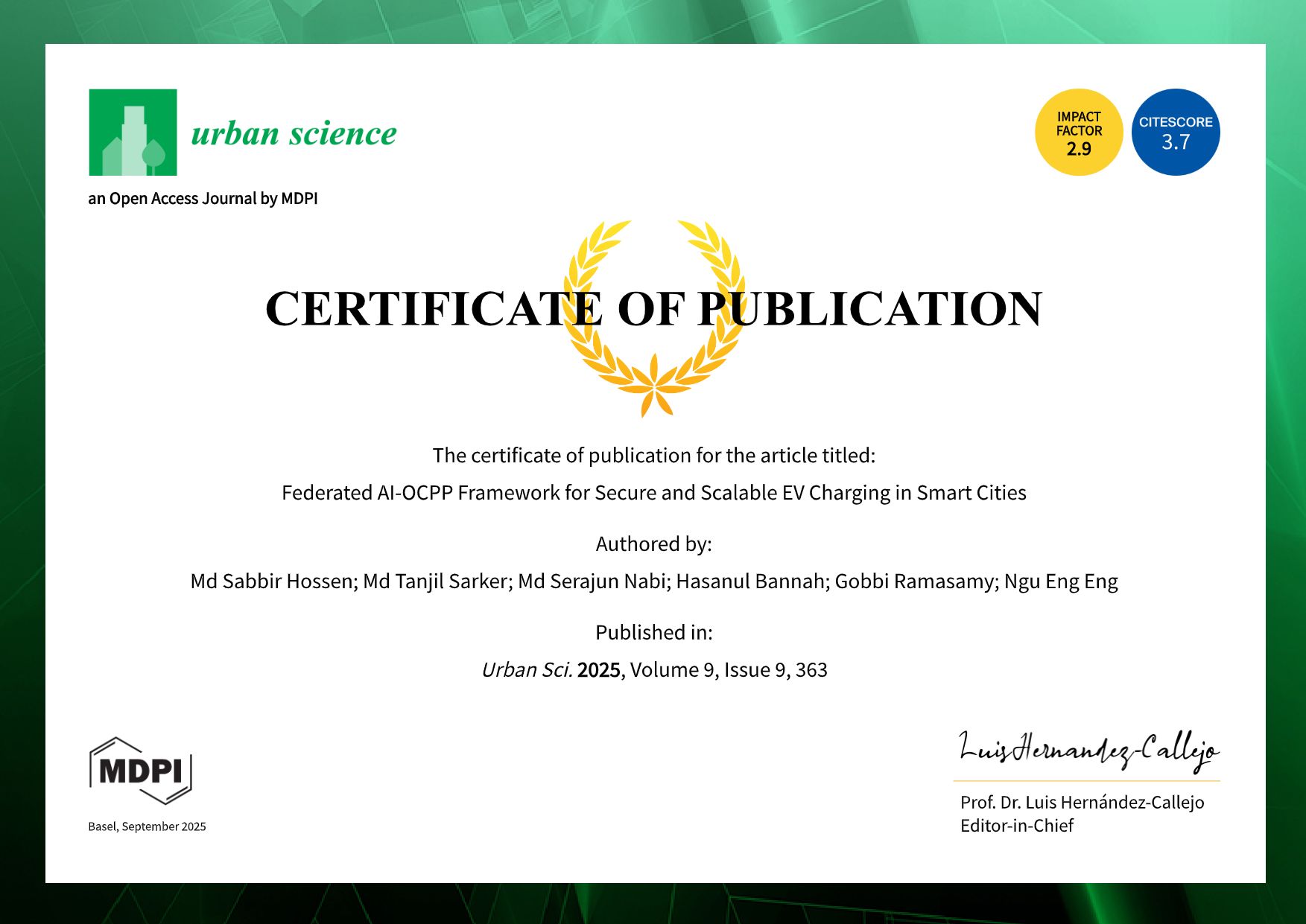 I have authored and co-authored peer-reviewed journal papers, conference articles, and technical reports focused on Artificial Intelligence, Smart Grids, OCPP-based EV Charging, and Sustainable Energy Systems. My works have been featured in Q1 journals, including World Electric Vehicle Journal and Urban Science. My research aims to advance green mobility, grid efficiency, and AI-driven optimization for next-generation smart cities.
